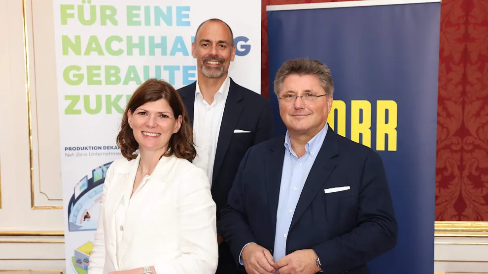Foto Copyright Holcim Österreich, Fotografin K. Schiffl, v.l.n.r. Karl-Heinz Strauss, CEO PORR Group, Nollaig Forrest, Chief Sustainability Officer HOLCIM Ltd., Berthold Kren, CEO Holcim Central Europe